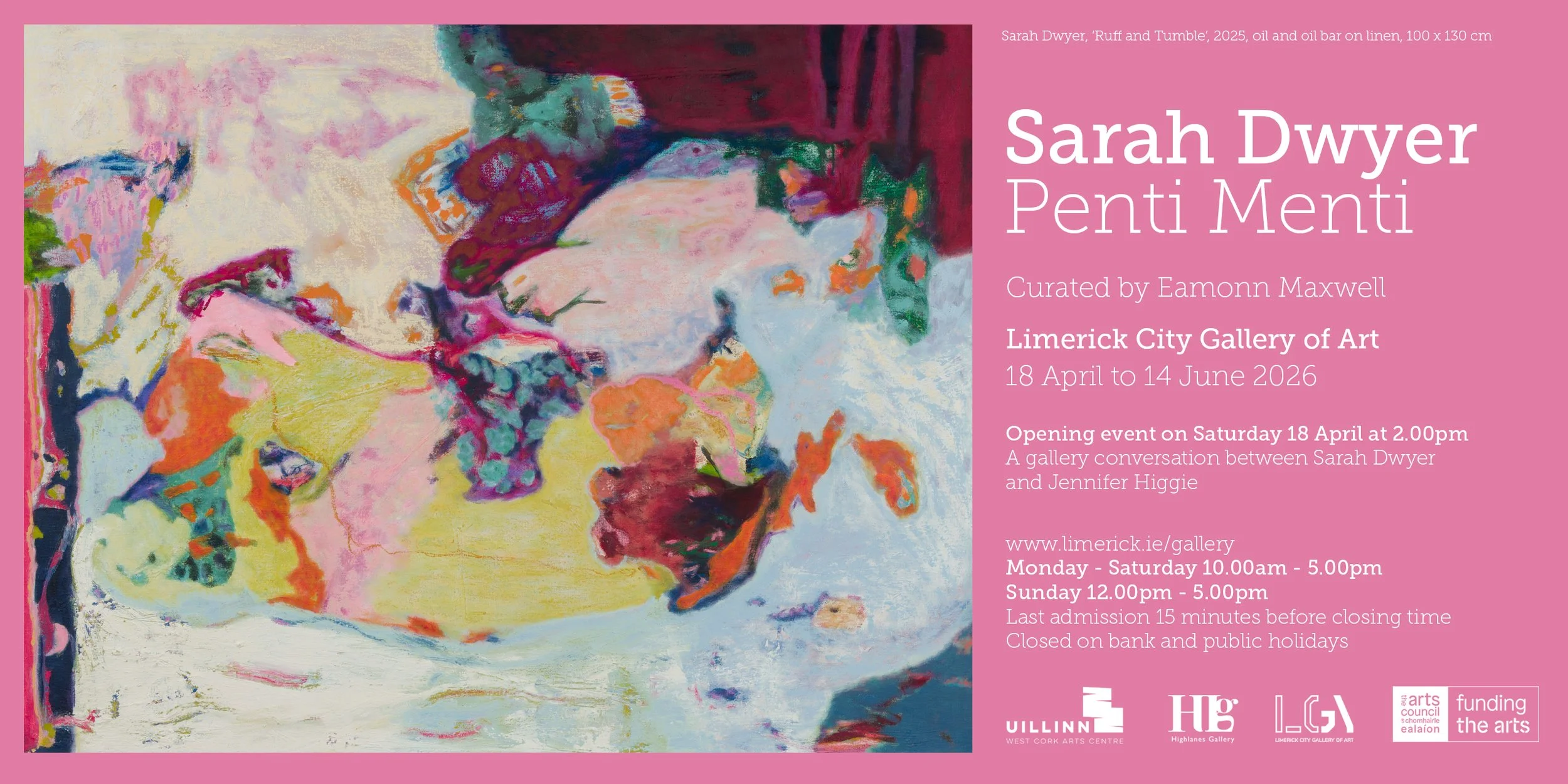 The exhibition was initiated by Uillinn: West Cork Arts Centre, is curated by Eamonn Maxwell and supported by an Arts Council / An Chomhairle Ealaíon Touring Award and will travel to Highlanes Gallery Drogheda (7 February - 18 March 2026) and Limerick City Gallery of Art (18 April - 13 June 2026). A major monograph will be published by Hatje Cantz in mid June.